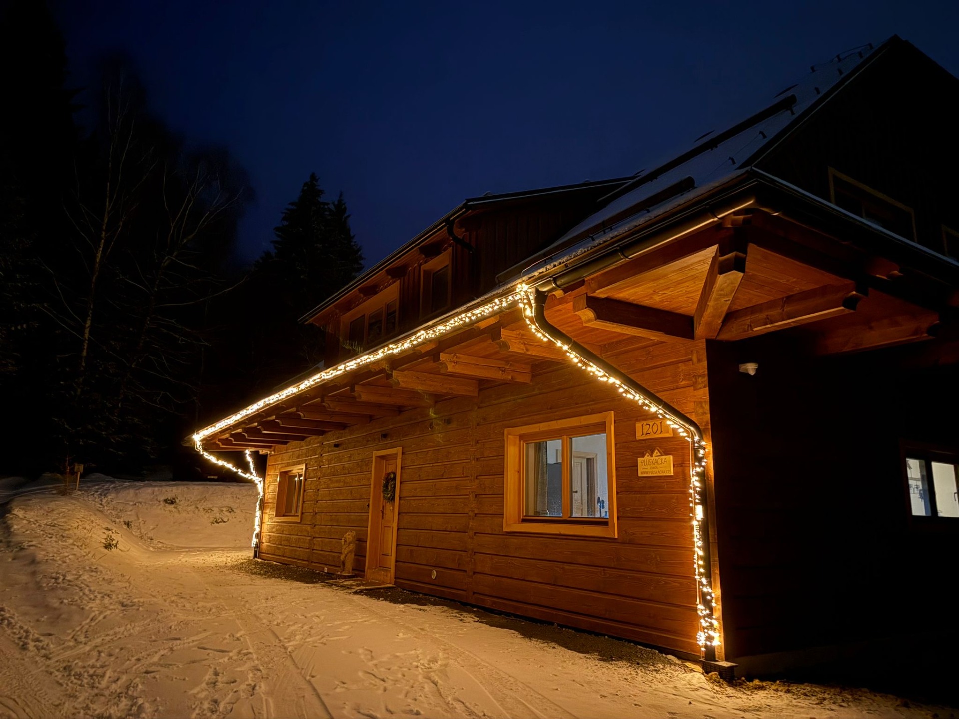 V přízemí se nachází denní část se saunou, obývacím pokojem a kuchyní, technická místnost pro lyže a kola. V patře jsou ložnice a koupelny pro až 16 osob, doplněné o herní zónu se šprtcem a šipkami.